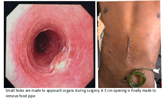 A 24 year old male (Name not disclosed) had chest pain for 6 months. Cardiac evaluation was normal. Endoscopy showed a small ulcer in food pipe. Sample of tissue confirmed cancer. Since, it was picked up early, he underwent thoracolaparoscopicesophagectomy and gastric pull through (chest and abdomen approached through small holes). Less pain, more cosmesis and early return to daily activities without compromising complete removal of cancer are advantages of this procedure.