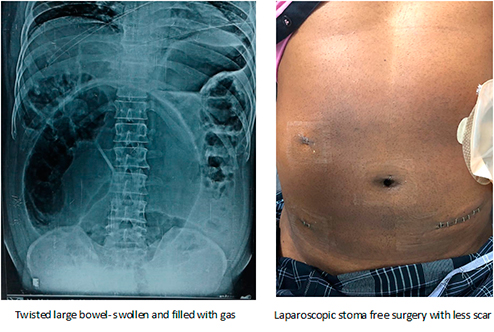 Mr. Maharaja, 45 years old gentleman presented with inability to pass stools or gas with severe abdominal distention since one day. He had sigmoid volvulus (A part of large bowel gets twisted on itself causing obstruction for passage of contents). Traditionally, patients were subjected to two surgeries with stoma (Intestine is temporarily turned to tummy and stools are collected in a bag) between surgeries. He was subjected to single stage stoma free laparoscopic surgery with return to normal activity within two weeks following surgery.